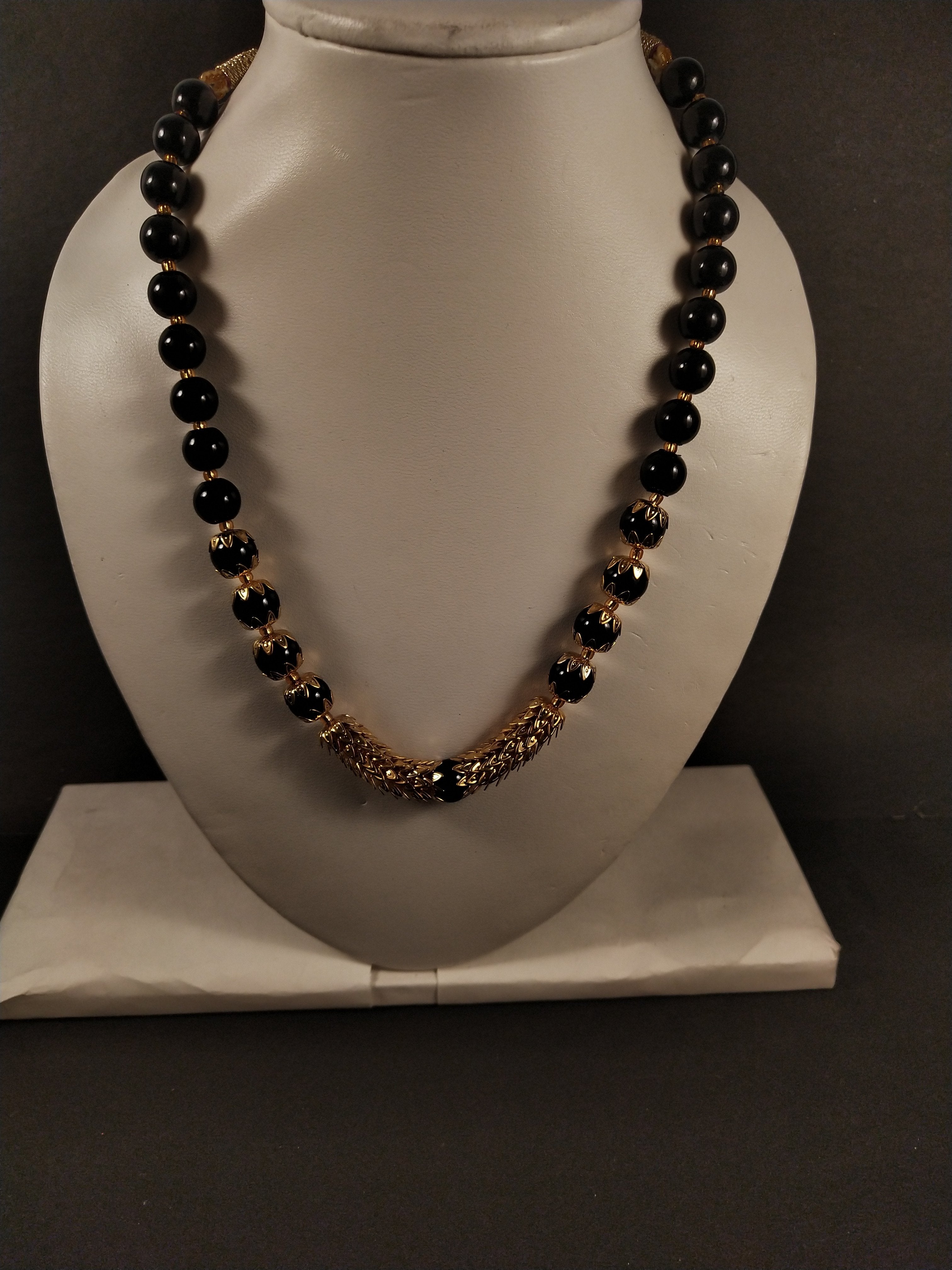 This classy and elegant necklace is fully adorned with black beads and gem. To make it more fascinating, the metallic color coating has been done. This must-have piece is perfect to wear on kind of occasions, parties, or festivities.