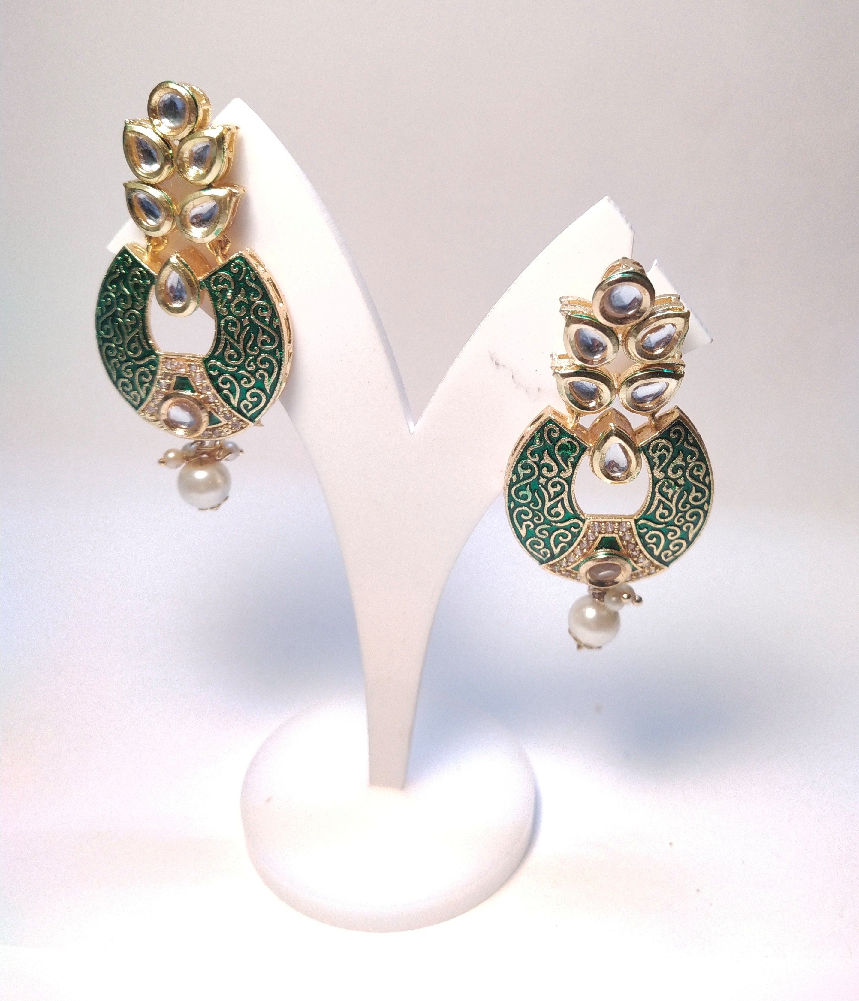 Impress your lady love by gifting these stunning drop earrings to her. This set of earrings is beautifully crafted to perfection and well suited for a traditional-modern look. Gold plated with Kundan-pearl work, this earring set is a must-have jewelry piece.
