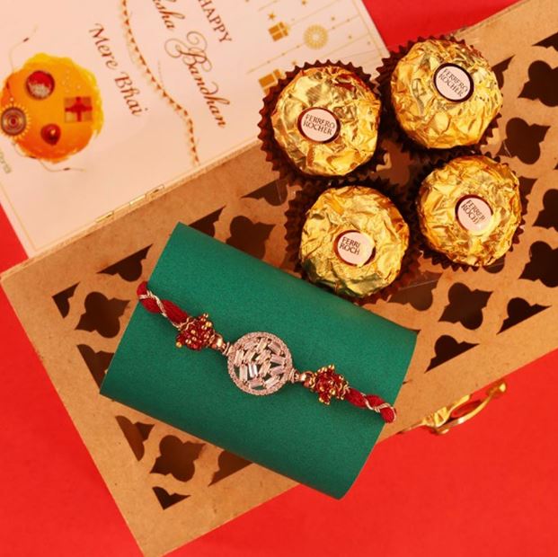 This Raksha Bandhan Special Gift Consists of: One Beautifuil Rakhi Ferrero Rocher - 3 Pieces Note: Sweets will be branded pack from Haldiram/Bikano/Vadilal or similar (as per availability) The photos are indicative. Occasionally, we may need to substitute products with...