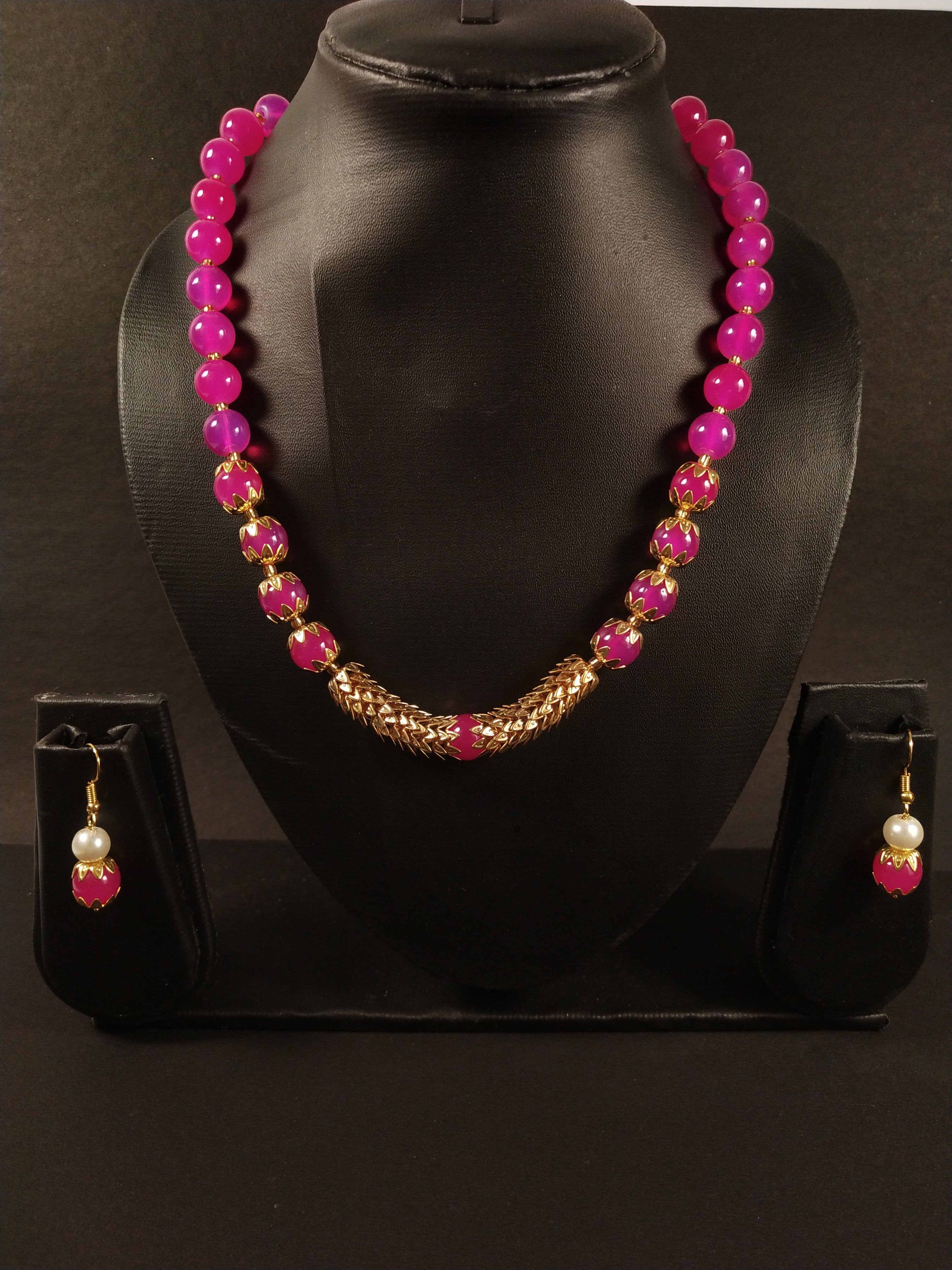 This elegant and beautifully crafted Pearl necklace set in Pink is a surely must-have piece of jewellery for any woman who adores pearl. Adorned with bright pearl beads and gem, this necklace set is yellow gold plated and is paired with 2 small earrings for finishing look.