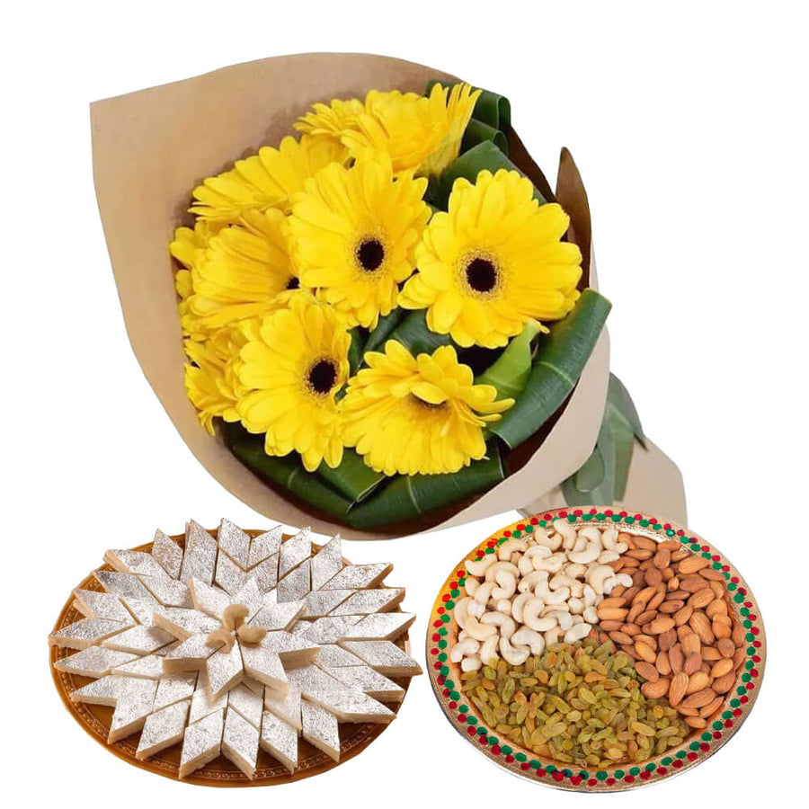- 10 Fresh Yellow Gerbera nicely wrapped with a Brown paper and Yellow ribbon bow
