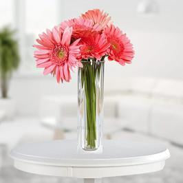 Send this lovely arrangement which will surely hypnotize your loved ones with its liveliness. The arrangement has 7 smiling pink gerberas in a glass vase are joyful flowers. They are a perfect representation of friendship, the pink gerbera daisy is quite an eye-catching flower.