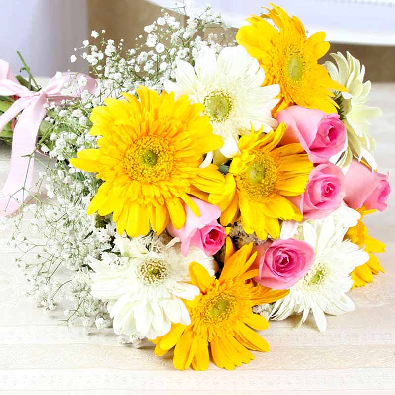 - 5 Stem Pink Roses,5 Stem White Gerbera and 5 Yellow Gerbera